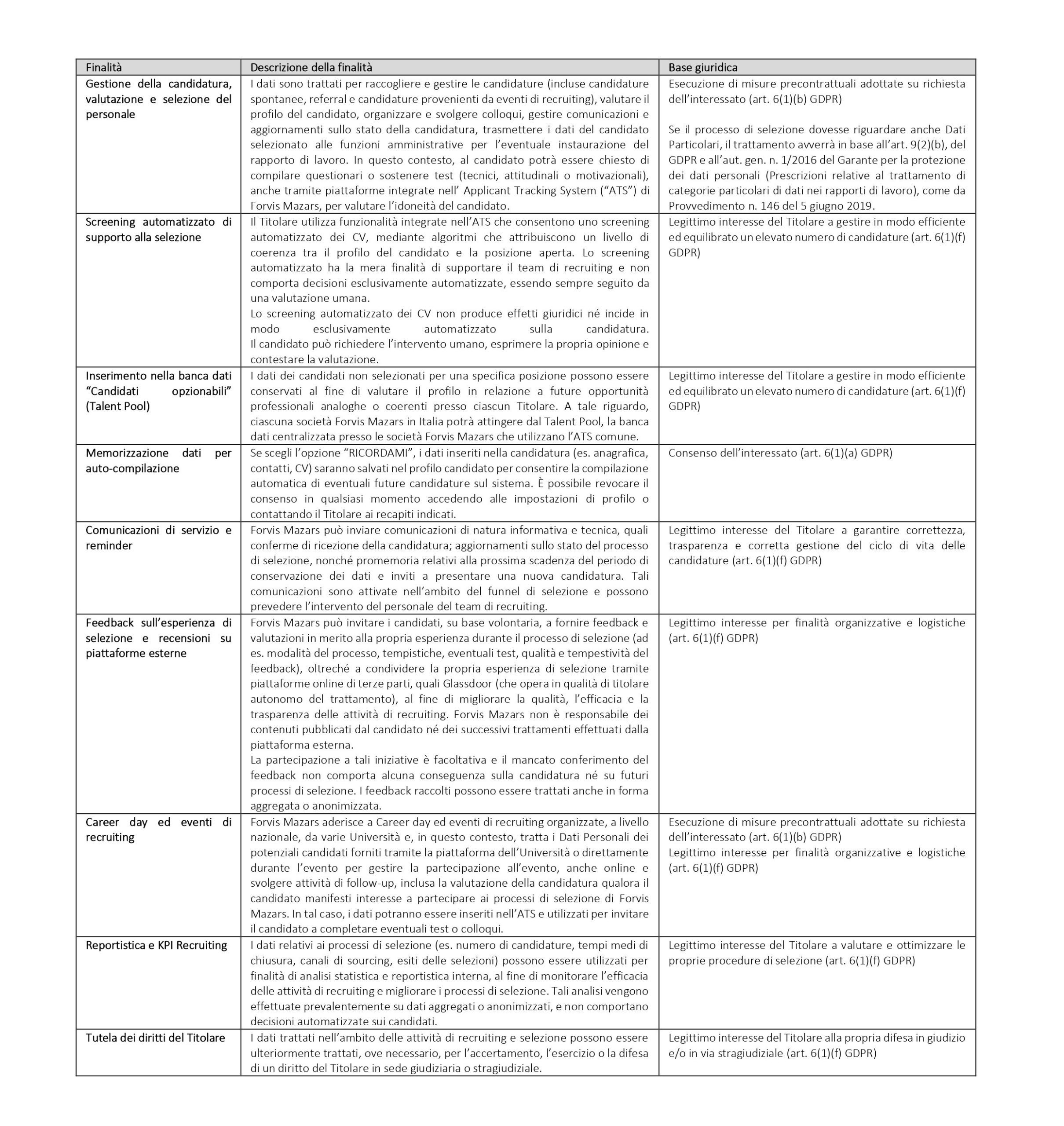 Ai sensi degli artt. 13 e 14 del GDPR 2016/679 (nel seguito, “GDPR”), la presente informativa viene fornita a coloro che intendono candidarsi per una posizione lavorativa presso Forvis Mazars o candidarsi spontaneamente.